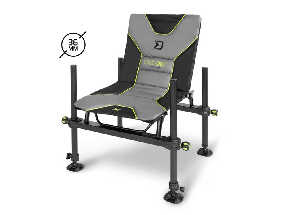 Na vrchu předních nohou se nacházejí univerzální závity, které lze využít pro uchycení různých feederových držáků nebo jiných doplňků. Sedací část je tvořena měkkou matrací, která umožňuje komfortní sezení během celodenního lovu. Barevně je laděna do šedo-černa, s výraznými zelenými doplňky ve stylu REAXE.