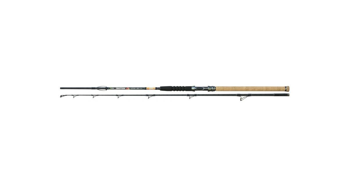 Emotion Catfish je dvoudílný prut s trnovou spojkou v délkách 240 cm resp. 270 cm a zátěžemi 400g resp. 700 g. Prut Emotion – disponující téměř parabolickou akcí – je vybaven pevnými tvrzenými očky, které jsou – stejně jako u modelu Therapy Catfish – v dostatečném množství rozmístěny tak, aby umožnily použít prut v kombinaci s multiplikátorem umístěným nad prutem. Prut má kovový odlehčený držák navijáku se stahovacím závitovým kroužkem jištěným dalším pojistným závitovým kroužkem, který stoprocentně aretuje naviják či multiplikátor v držáku. Prut je vybaven prodlouženým madlem nad držákem navijáku , které rozšiřuje varianty držení prutu během zdolávání. Emotion Catfish je ve srovnání s modelem Therapy Catfish mírně houževnatější, díky použitému materiálu má i štíhlejší blank a je – dá-li se toto slovo použít u prutu se zátěží 700 g – i citlivější na potenciální rychlé výpady zdolávané ryby. Emotion Catfish má korkové madlo, které je na konci rozšířené – koncovka je však z měkkého korku a má rovné dno. A důvod? Při zdolávání rybáři často opírají koncovku prutu o stehno, kyčel či břicho. Zvětšený průměr koncovky tohoto prutu tak při zdolávání méně tlačí do zmíněných partií. Stejně jako Therapy Catfish je možné použít i model Emotion Catfish pro mořský rybolov. Parabolické akce, houževnatosti a odolnosti tohoto prutu jsme dosáhli použitím kompozitního materiálu, který je složený z uhlíkových a sklolaminátových vláken. Uhlíková vlákna s vysokým modulem pružnosti (UHM – Ultra High Modulus) dávají prutu rychlou reakci a sklolaminátová zase vysokou pevnost a odolnost. Kombinace těchto dvou materiálů je ideální pro extrémně namáhané pruty používané při lovu velkých ryb.“ Prut má 8x očko