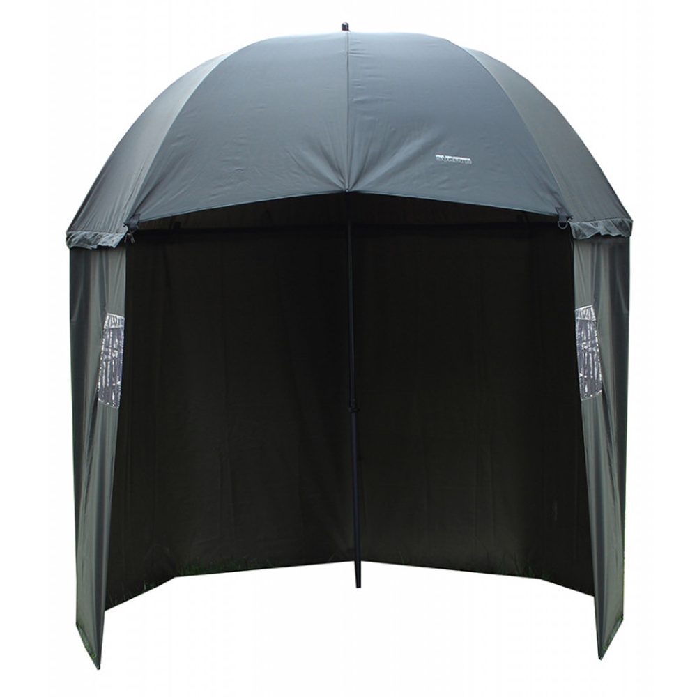 Rybářský deštník s bočnicí z 210D materiálu. Švy jsou podlepené, po obvodu vrchlíku jsou čtyři očka k ukotvení, deštník je dodáván se čtyřmi stavitelnými provazy a kolíky.