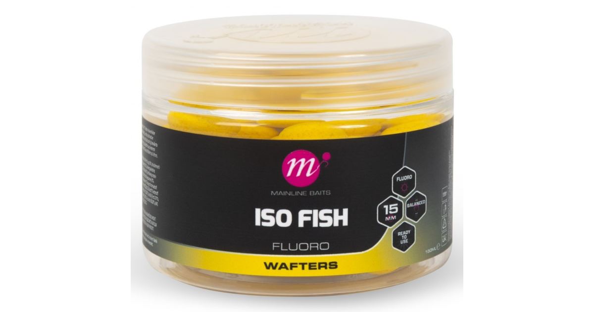 Mainline Vyvážené Boilie Fluoro Wafters ISO Fish jsou speciální boilies určené pro lov ryb. Jsou vyrobeny ve velikosti 15 mm a balení obsahuje 150 ml.