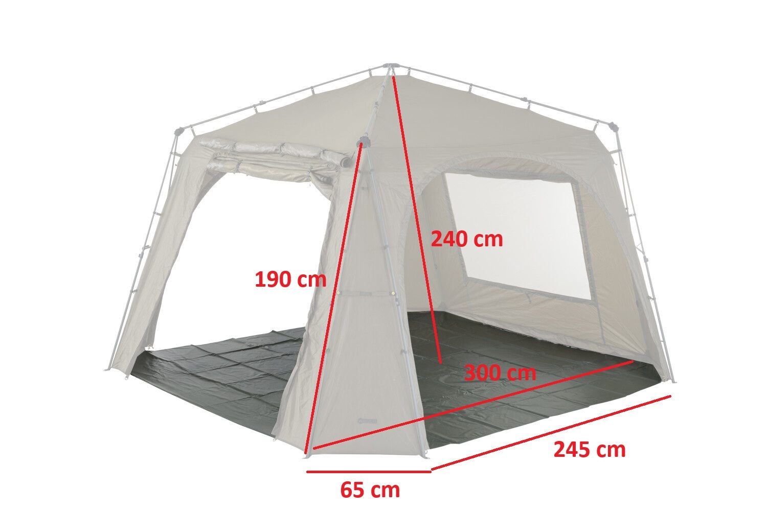 Rozměry přístřešku jsou přibližně 300 x 300 x 200 cm, což poskytuje dostatek prostoru pro několik osob, vybavení či rybářské potřeby. Kapacita je ideální pro menší skupiny nebo rodiny s dětmi.